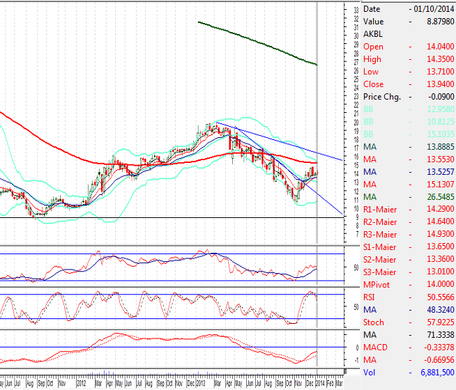 Our Preference: Short Sell AKBL Between 14.00 and 14.70 and Averages till 15.10 with a strict stop loss of 16.36 and profit target at 11.55