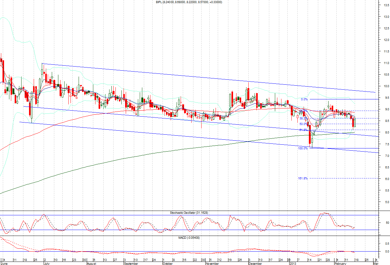 Note: BIPL is best buy as long as 7.90 is support as it have fullfilled its 61% correction (Retracement) and now is moving upward to its previous high which can be amended this time. as in daily candle it have created bullish dark cloud pattern which is sign of reversal. 7.90 is support as it is on 280 days moving average and also a bearish tend channel. Breakage of 7.90 can push it towards 7.20 which is also a strong support and can be get average there.
