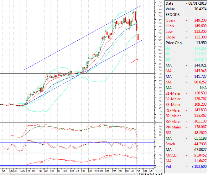 NOTE: EFOODS is trying to fulfill its 50% correction level of its bullish run since Nov. 2012 at 116 also is going to get supports from weekly upward price channel along with 280 days moving average. So buying can be initiated in EFoods around given levles.