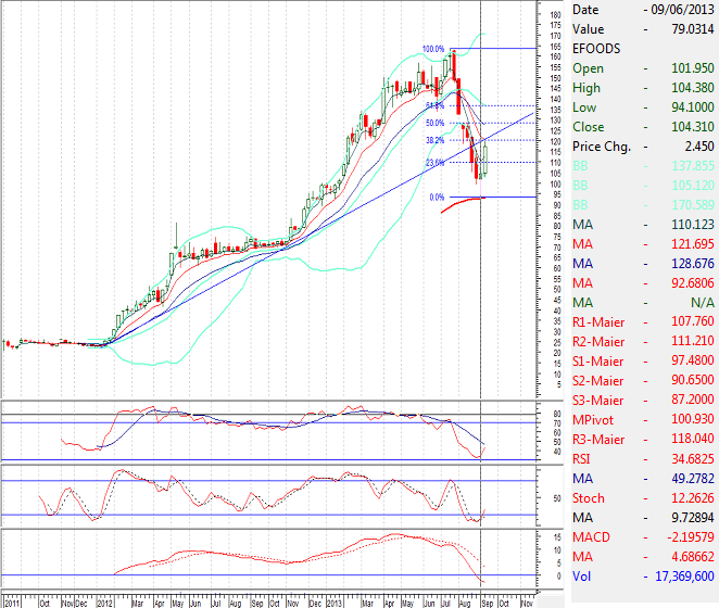 Our Preference: Short Sell EFOODS below 118.04 till 119.34 with a strict stop loss of 122.59 and profit target at 106.15 and 100.44