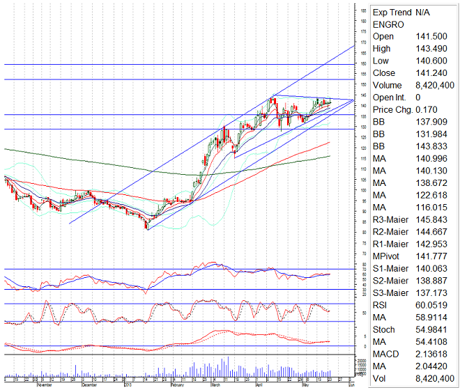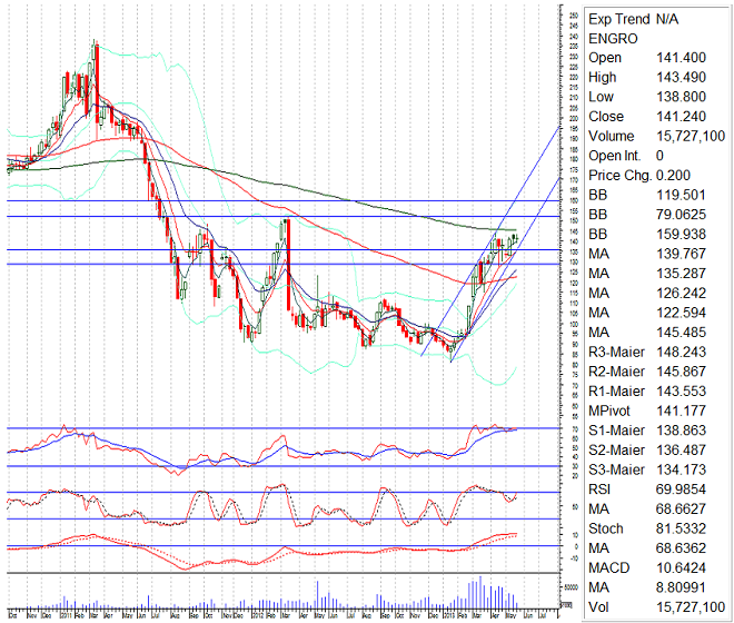 NOTE: ENGOR have been capped by a strong resistant trend line at 146.02 and have a 100 months moving average as resistance at 145.48 also have reached in over bought region in monthly chart along with a resistance at 146.02 from its 280 weeks moving average. so a caution is generated around these levels. It also have generated a triangle again on these levles and breakage of either side of this triangle will call for a new spike or dip in Engro.