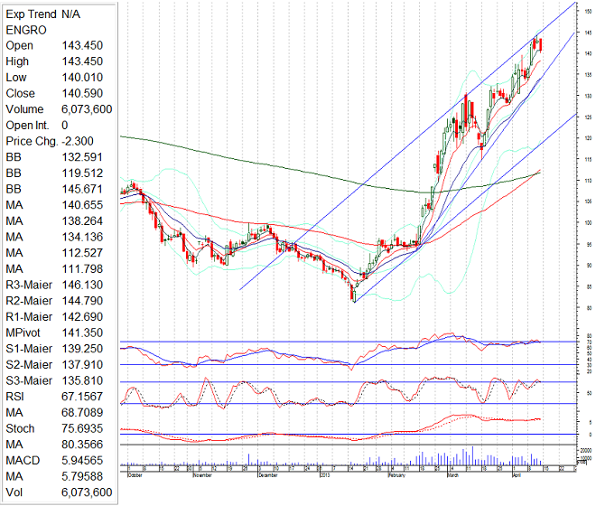 NOTE: Engro can get a short term support at 134.96 so swing trading strategy can be adopted by buying around 137.51 with strict stop loss. A Trend line will give short term support to engro at that level.