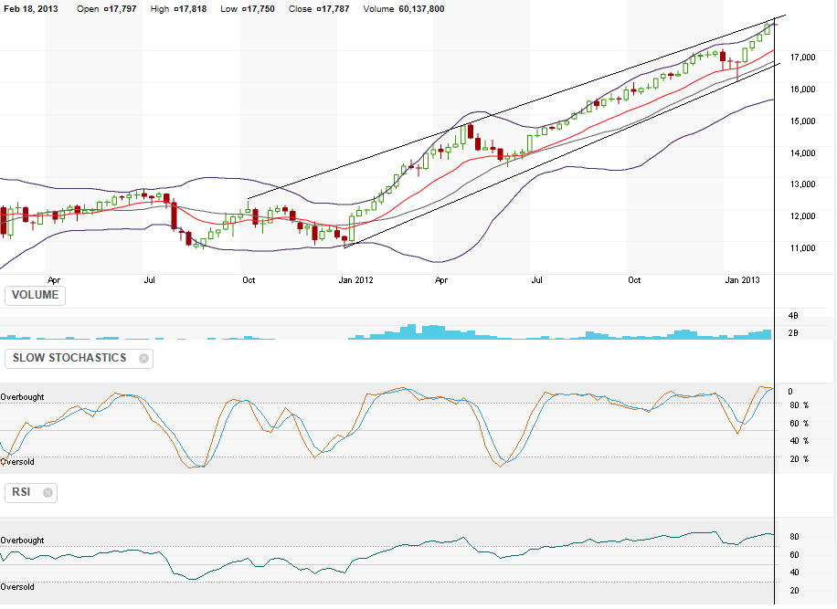 Start of Bearish Trend have already supported by Weakly Closing of last week ending 15-Feb 2013 as KSE-100 closed outside of Bollinger Bands, Means if Previous High would not be ammended then market can start a crash behaviour for upcoming 3-5 weeks.