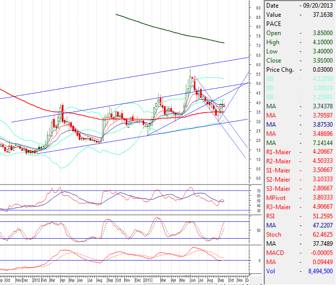NOTE: PACE have recovered from its bearish channel and is moving towards 4.38 to retest its resistant trend line.