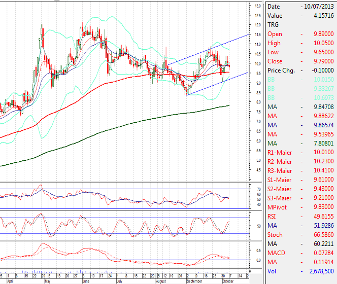 Our Preference:BUY TRG above 9.53 with a strict stop loss of 9.16 and profit target at 11.12