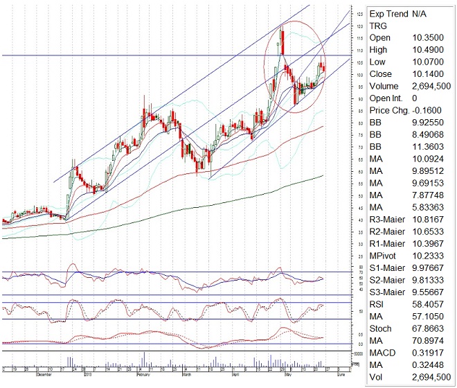 TRG is Stuck between two strong levels so its recommended for small investors to wait for breakage of either side and then have to take entry. If someone have facility to short sell TRG then they can short it will strict stop loss of 10.78 and profit target at 9.24 and 8.72
