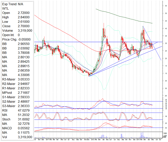 Our Mid Term Prefrence: Buy WTL as long as 2.62 is sustained as support with strict stop loss of 2.36 and profit target at 3.23 and 4.50