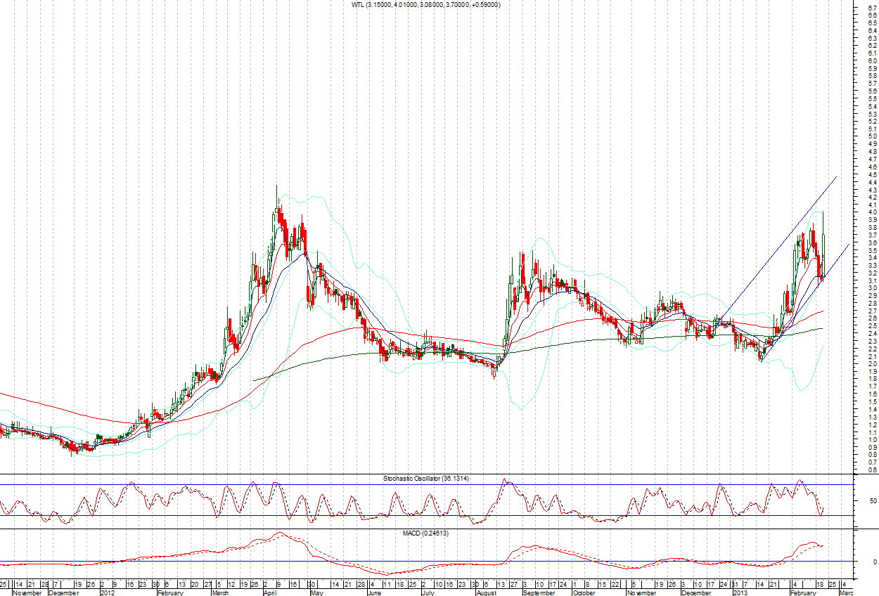 NOTE: WTL is moving in an upward channel on daily and weekly basis and retested that channel's lower band at 2.95 to complete its 38% correction/Retrace. now it is going to expand its correction where 280 weeks average will become a resistance at 4.44.