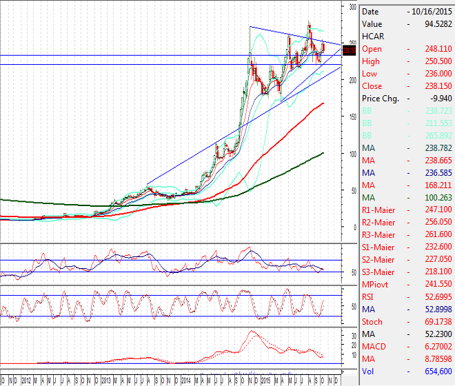 NOTE: HCAR is caged in a triangle and right now its getting support from a horizontal support in that triangle. Daily Stochastic have generated crossover while weekly stochastic is already in bullish mode.