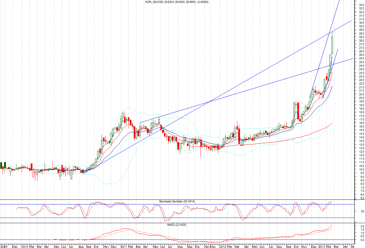 Note; NCPL have touched its upper most resistanant trend line since 2009 and now is trading in overbought region on daily, weekly and monthly basis, it have not taken even a slight correction since 02 Nov. 2012 and a correction is due in NCPL in comming days, which can push prices back towards 25.44 and 24.73 to retest lower lines of upward channel, currently Moving averages, MACD, Bollinger Bands and Stochastic are not supporting its further bullish trend.