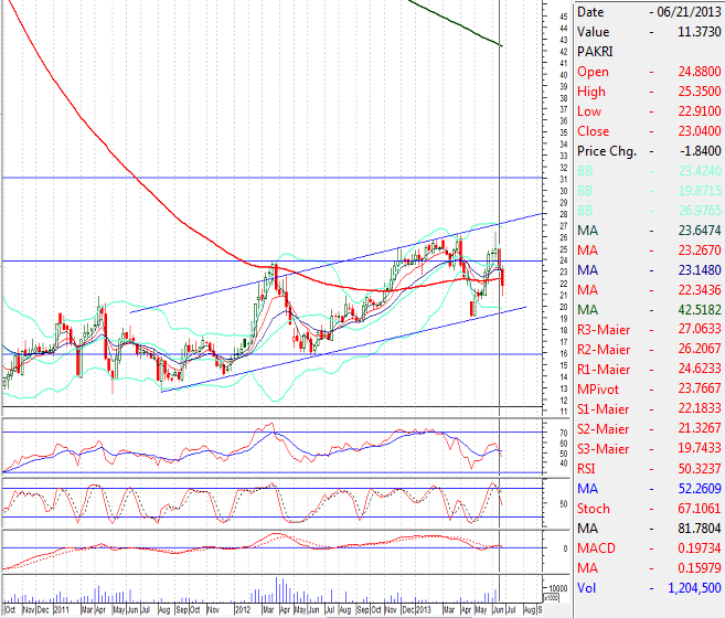 NOTE: PAKRI is getting support from its weekly bullish channel and is going to take a reversal towards 23.88 in short term and towards 27.33 on mid-term bases. It have came back after retesting its resitantce of same trend channel, so its recommended to buy PAKRI to take benifit of its short term price move.