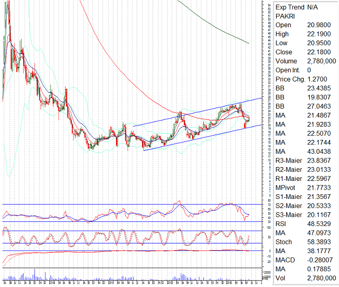 NOTE: PAKRI Prices took a rebound after retesting its support line of its bullish weekly channel and now have become stuck between its 50% to 61% Correction area. Its also getting a resistance from its 100 weeks moving average 22.27 so may be it will take a dip from these prices so that will be a best 0ppertunity to buy PAKRI other wise if it will become able to close above 22.27 area then it will also be a good sign for PAKRI to continue in bullish sentiment. so its recommend to start buying PAKRI and add average on each dip with profit target at 26.76.