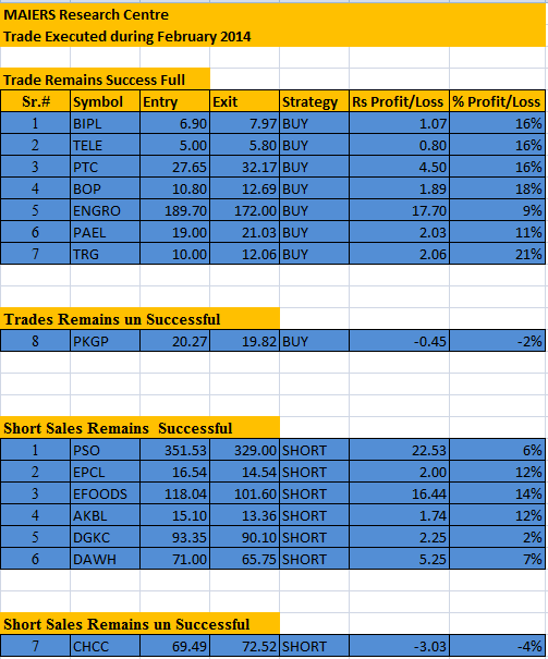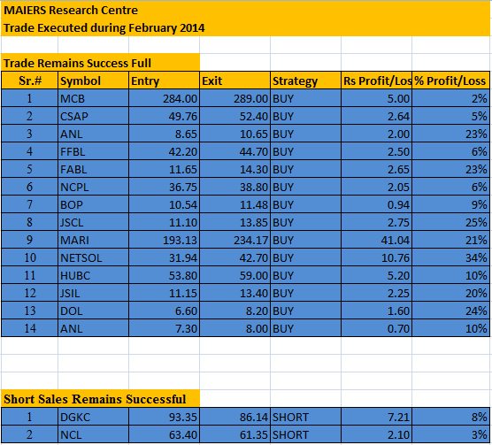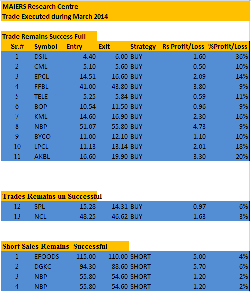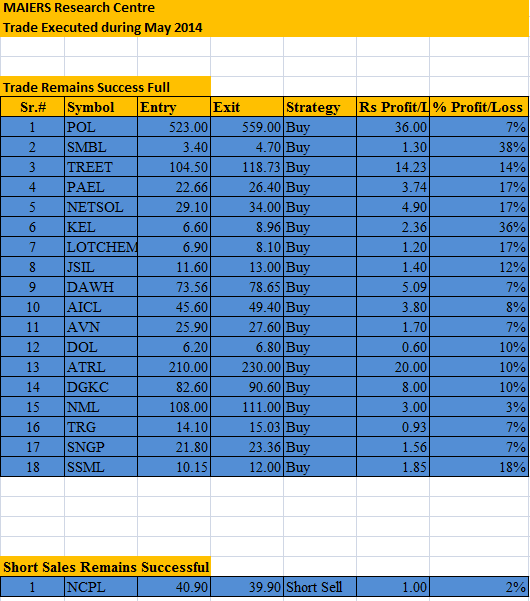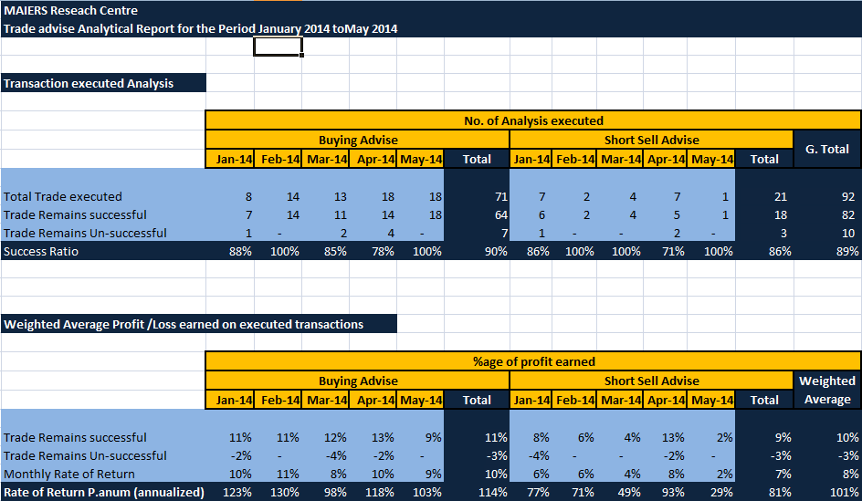 With Grace of Almighty Allah our Premium Analysis remain on track during first five month of 2014 (Jan 2014-May 2014). Results appeared with 89% Accuracy and 101% Weighted Average Rate of Return Annualized Bases. While Monthly Average Rate of Return Remained 10% for first 5 Months of 2014.