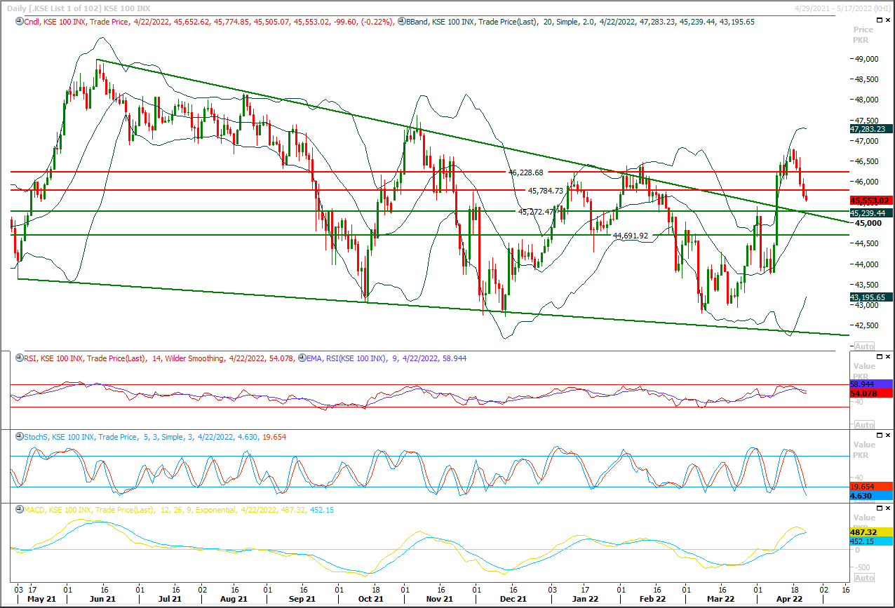 The Benchmark KSE100 index have reached a crucial level while taking correction of its last bullish rally and it's expected that it would try to establish ground initially above 50% correction level which falls at 45,200pts during current trading session while breakout below that region would call for 44,900pts and 44,700pts. Overall a volatile session would be witnessed today because hourly momentum indicators are ready for a pullback but daily momentum is still bearish therefore it's recommended to stay cautious. Buying in chunks could be beneficial in this region with strict stop loss of 44,700pts for short term trading purpose and index would start a sharp rally if it would succeed in maintaining above 45,200pts which may lead index towards 45,780pts and breakout above this region would call for 46,200pts. On longer run index still have succeeded in maintaining above resistant trend line of its previous descending wedge and whole this bearish run would be considered as retesting of this line in case of maintaining above 45,200pts. But today's closing below 45,200pts would push index into a sluggish zone which would need some healthy volumes to start recovery in coming days.